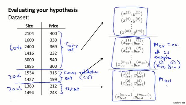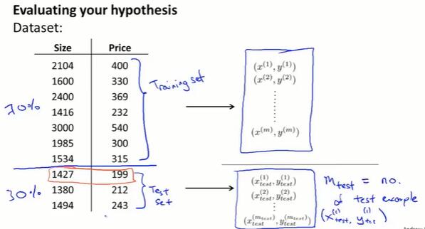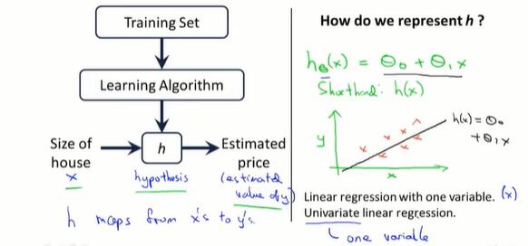 机器学习算法从训练集得出函数h(hypothesis),表示从x到y的对应关系。