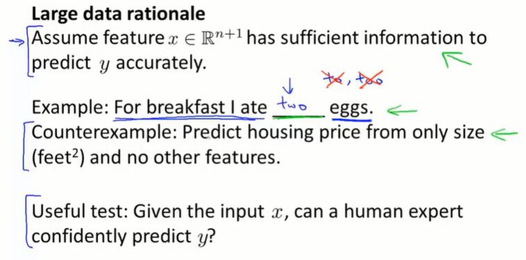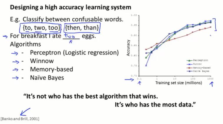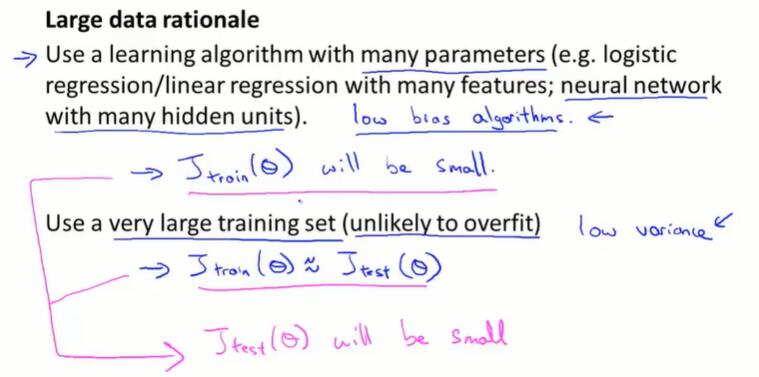 一个得到高性能机器学习系统的方法:做一个低偏差的机器学习算法,并且使用庞大的训练集去训练它。