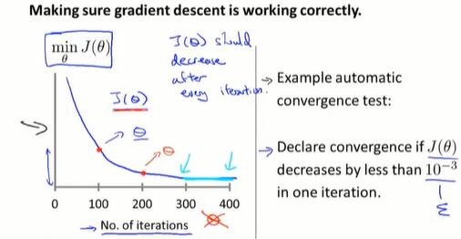 在批量梯度下降中,通过绘制 $J(\theta)$ 的图像来判断收敛。原因是批量梯度下降的每一次迭代,代价函数都是减小的。需要在算法运行过程中扫描一遍整个数据集来计算当前的 $J(\theta)$ ,所以数据集很大的时候也不好用。