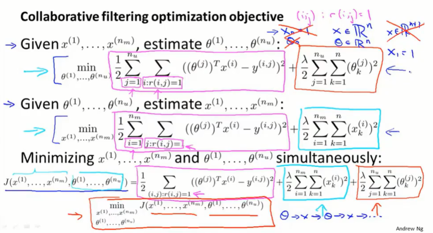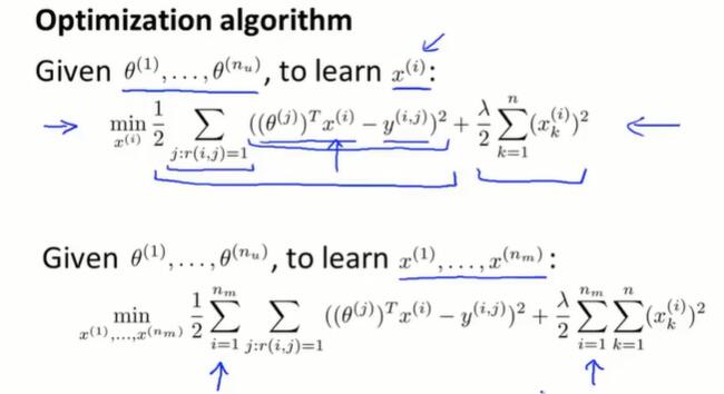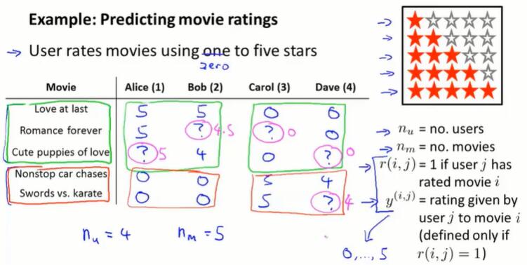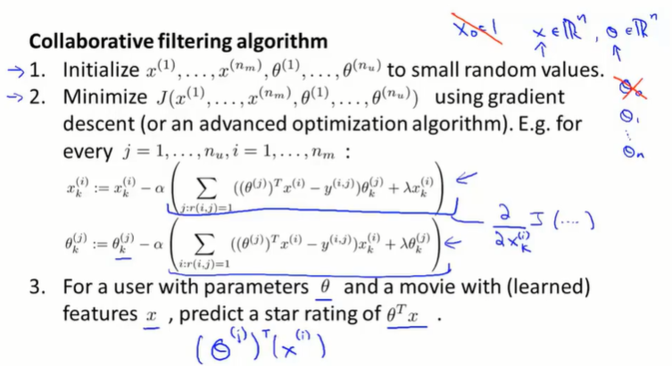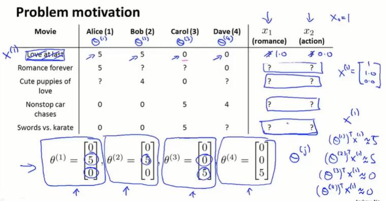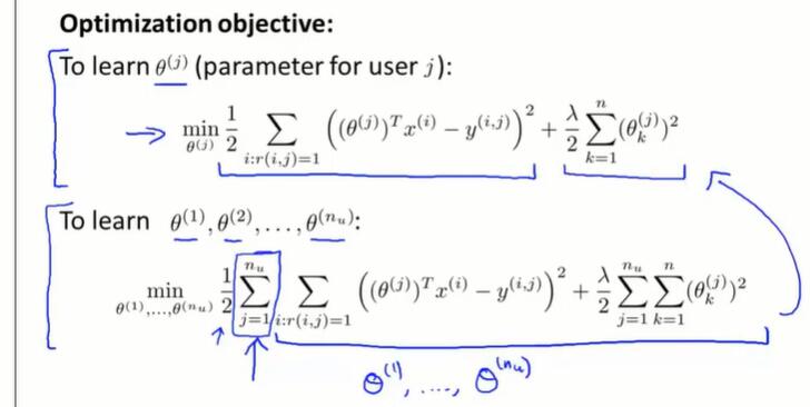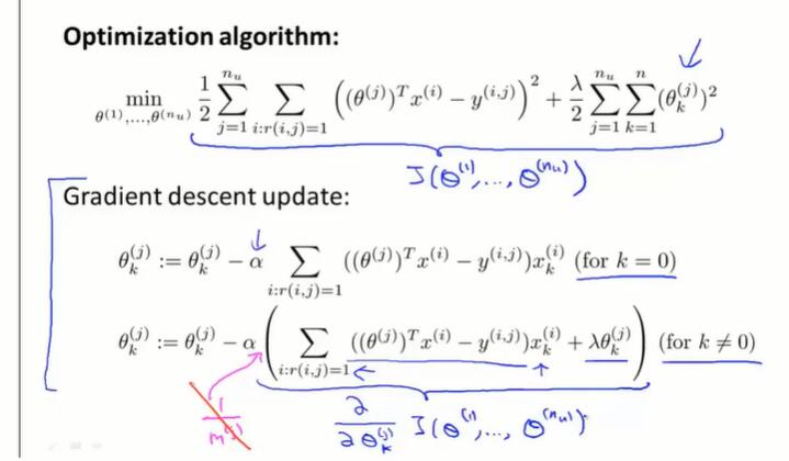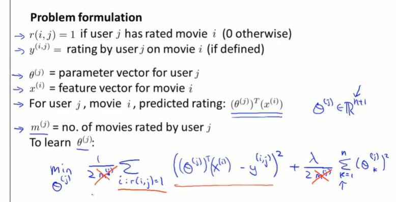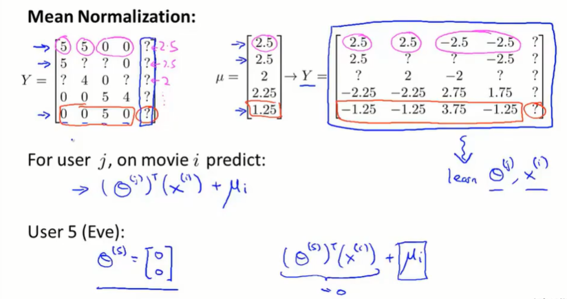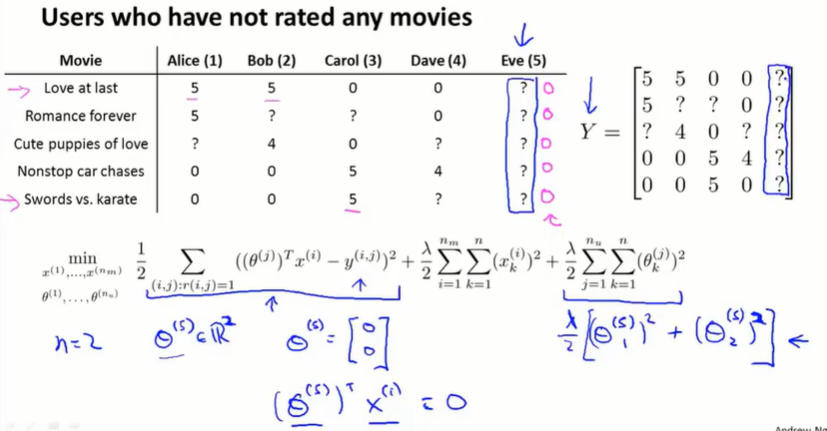 如果一个用户没有给任何的电影评分,那在梯度下降最小化 $J$ 的过程中,会学习到 $\theta^{(j)} = 0$。如果用 $\theta^Tx$ 做预测,会将所有的电影分数预测为0分,并且不会给用户做任何推荐。