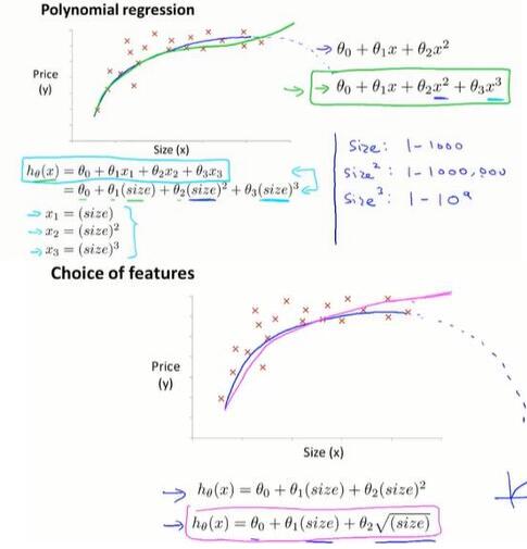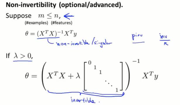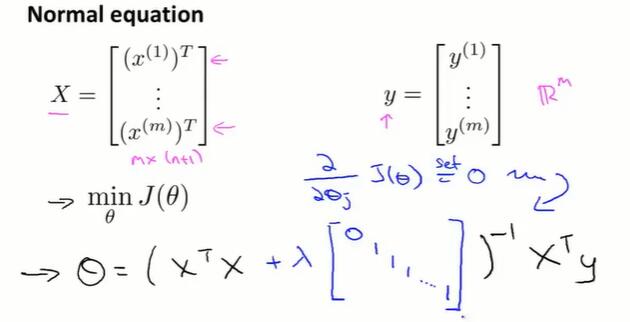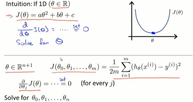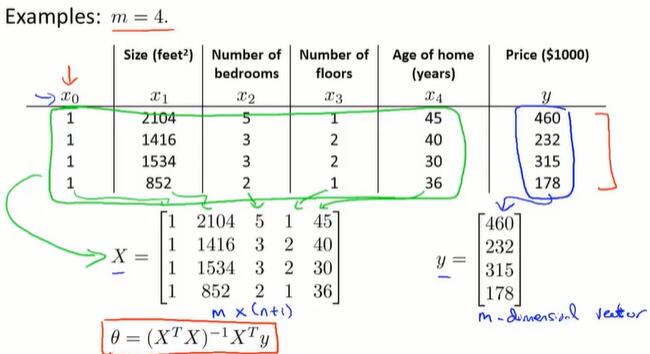 - 在线性代数上,存在一个解法,可以在不需要多步梯度下降的情况下,也能解出代价函数的最小值,这是另一种称为正规方程(normal equations)的方法。实际上在数据量较大的情况下,梯度下降法比正规方程要更适用一些。