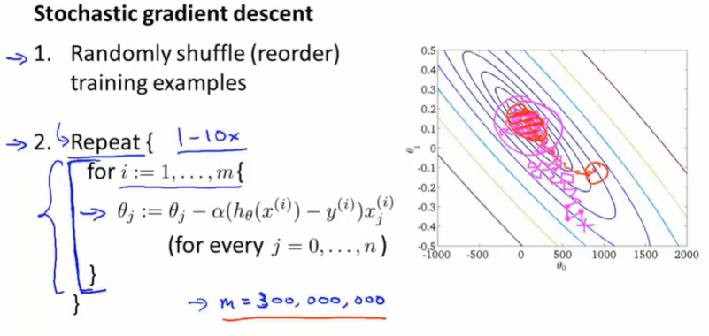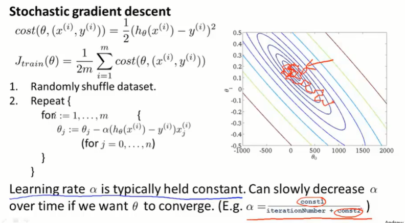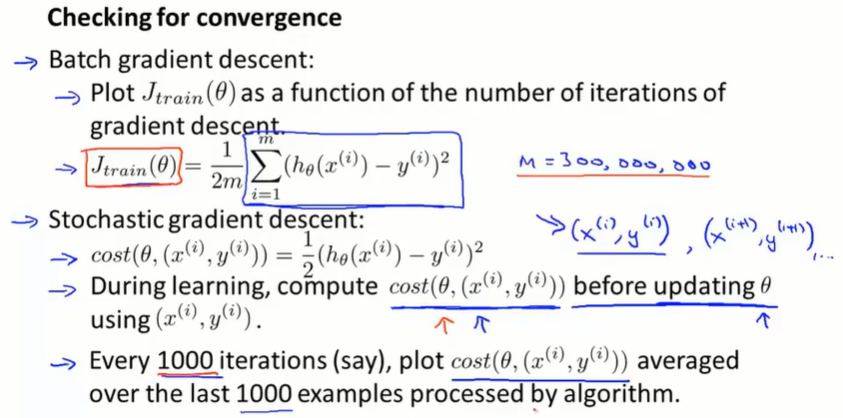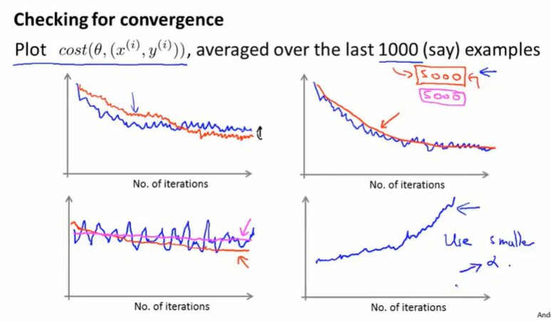 随机梯度下降每次只考虑一个单独的样本,每次让算法前进一点,就不需要停下算法来计算 $J(\theta)$ 了。只需关注单个样本 $(x^{(i)},y^{(i)})$ ,在用该样本更新 $\theta$ 之前,计算 $cost(\theta, (x^{(i)},y^{(i)}))$ 。并且在一定量的数据样本的迭代后,打印 $cost$ 的平均值。