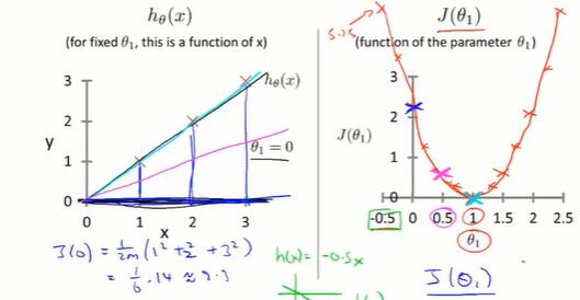 取不同的θ0θ1,得到不同的h(x),对应不同的J(θ0, θ1).