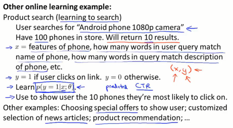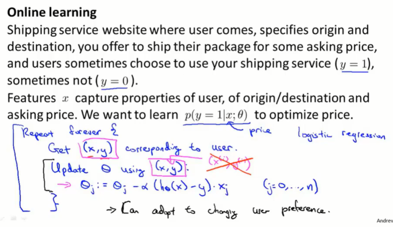 跟随机梯度下降很相似,区别是:在线学习不使用固定的数据样本 $(x^{(i)},y^{(i)})$ ,而是根据目前的数据流 $(x, y)$ 来训练模型。这要求数据流比较多,这样就不用重复学习同样的样本了。