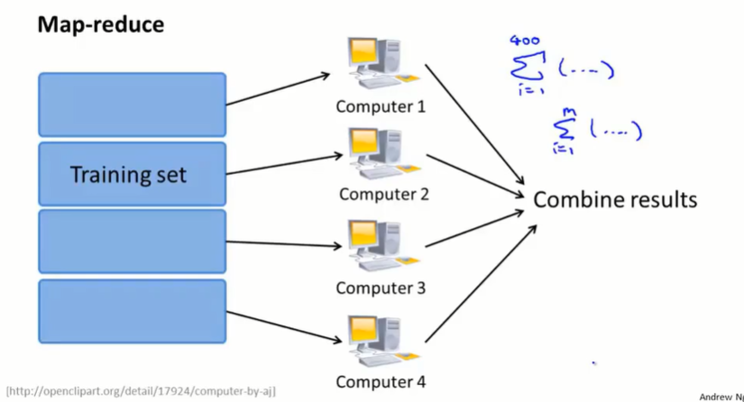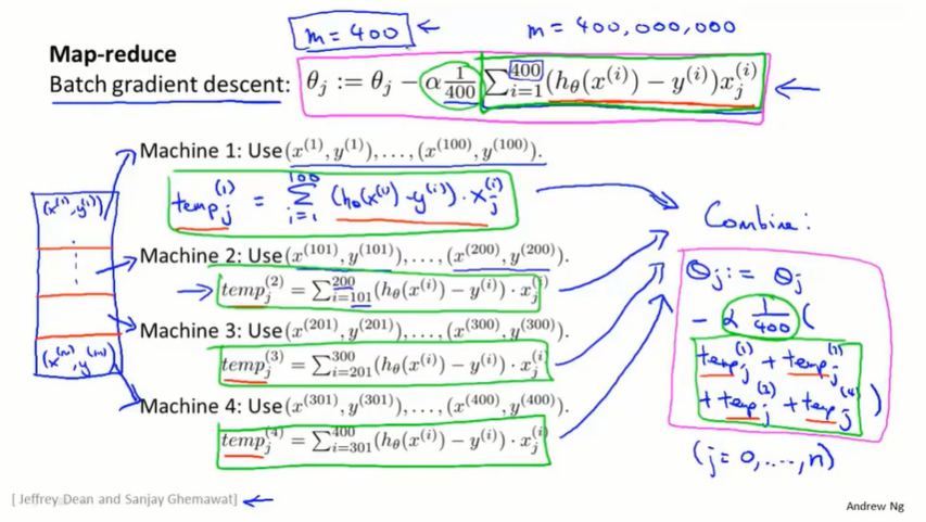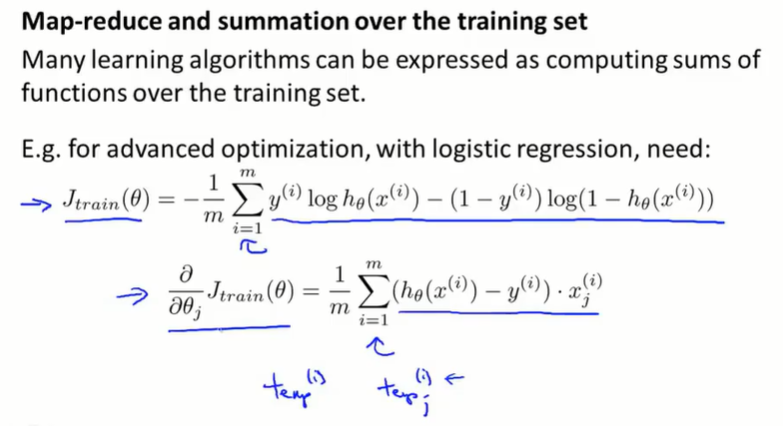 实际上,很多学习算法都可以表示成对训练集函数的求和,而在大数据集上运行所消耗的运算量就在于需要对非常大的训练集进行求和。所以只要学习算法可以表示为对训练集的求和,或者学习算法的主要工作可以表示成对训练集的求和,那么就可以使用 map-reduce 将学习算法的适用范围扩大到非常大的数据集。