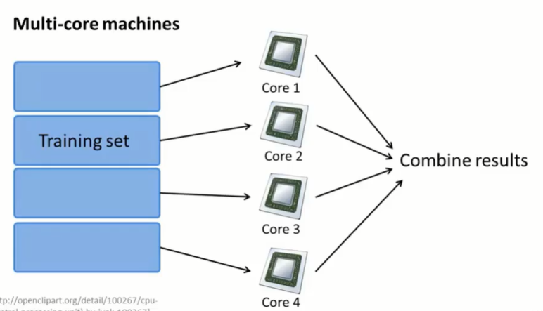 举例:如果使用高级优化函数来训练logistic算法,需要计算两个重要的量:一个是对于高级学习算法,需要提供一个过程来计算优化目标的代价函数 $J_{train}(\theta)$ ,第二个是计算偏导数 $\frac{\partial}{\partial \theta_j}J_{train}(\theta)$。将这两个求和过程分散给多个主机,然后把结果整合起来,就获得总的损失和总的偏导项,接着将这两个值交给高级优化算法。