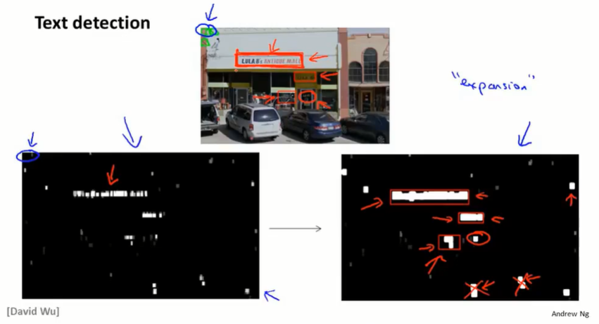 预测阶段:使用小的滑动窗口,预测图中各个区域有文字的概率(越亮代表有文字的可能性大)然后进行放大算子,将白色区域扩大。并对长宽比进行筛选。