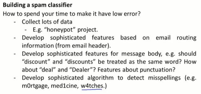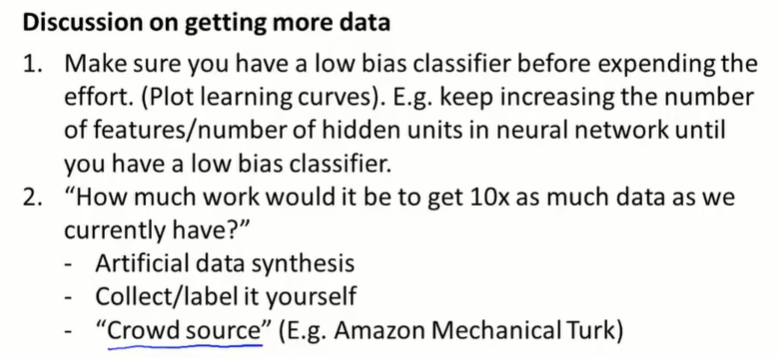 - 扩充数据集有用吗?在扩充数据集之前,首先要保证我们的分类器偏差较低。这样,更多的数据才会起作用。标准的做法是绘制学习曲线,确保这是低偏差、高方差的分类器。如果分类器的偏差太高,可以尝试增加特征的数量,或者增加神经网络隐藏神经元的数量,直到偏差降低。然后再花精力生成人工训练集。