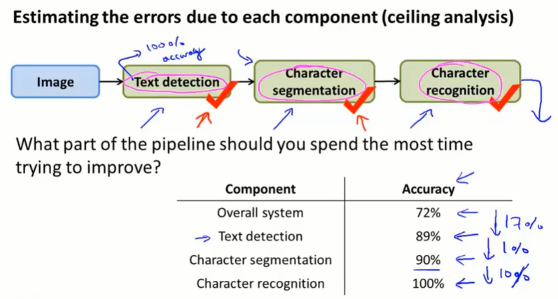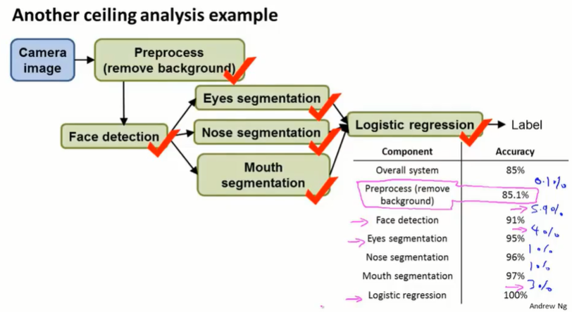 对学习系统使用一个数值评价度量:准确度accuracy。先看整个系统的表现(72%),然后人工按顺序给出每个模块的正确答案,然后看整个系统的准确度表现提升。这样,我们可以看出各个模块的上升空间有多大。