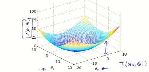 有两个参数时,得到 J(θ0, θ1) 的三维图像。