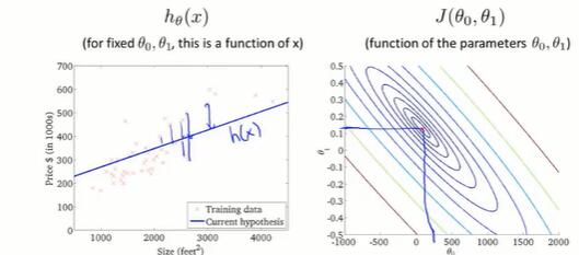 选择θ,使J的值最小化。此时h函数最好地拟合了现实情况。