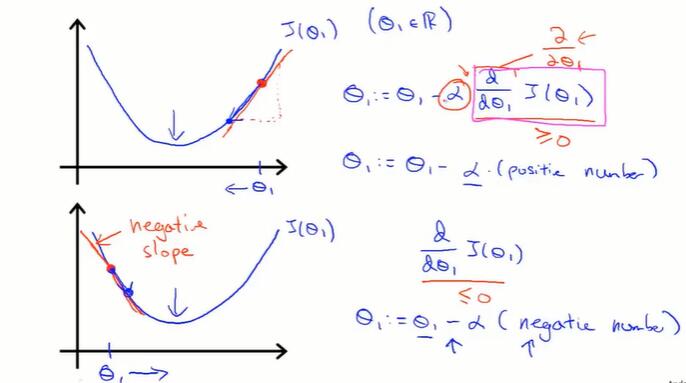 以单个变量的函数为例。偏导数的值保证了 $\theta$ 一定朝 $J(\theta)$ 下降的方向变化。