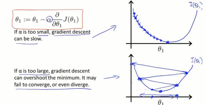 α 太小,步数太多;α 太大,会导致无法收敛甚至发散。
