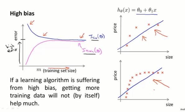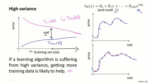 在高偏差的情况下,让数据集增大效果不好;在高方差的情况下,增大数据集一般是有效的。