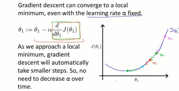 当学习率 α 不变时,梯度下降进行的过程中,偏导数通常会变小,因此每一步下降幅度会减小。