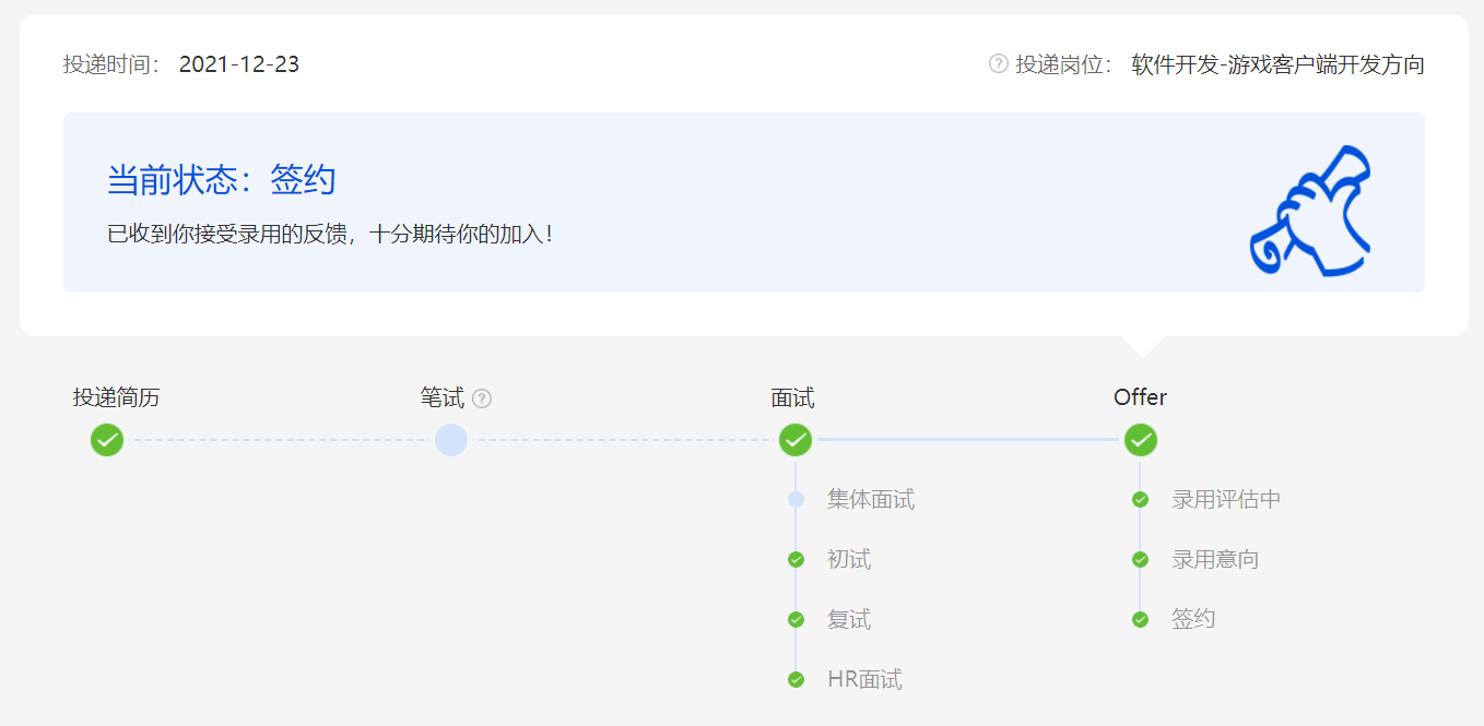 但2021年下半年我参加了腾讯游戏客户端开发公开课,在课程结束时,可以自愿进入面试环节,据hr说这算是暑假实习的提前批。因此我抱着反正不亏的心态投了简历,并经历了相对曲折的面试流程,最终到达了Good End。