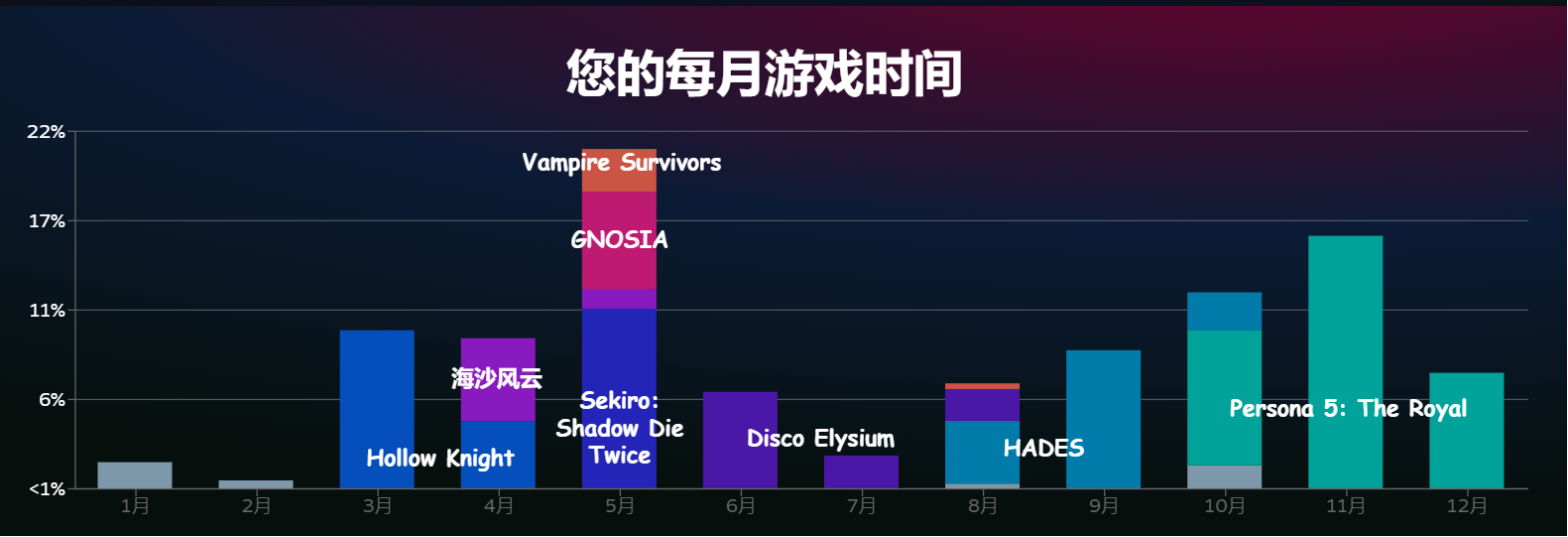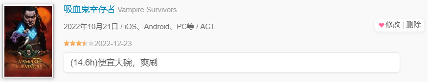 此外,『吸血鬼幸存者』也是我在5月玩的、值得一记的游戏。虽然画面不好看,但技能、道具设计得多样且好玩,便宜大碗,很有诚意。甚至引领了行业发展,催生出“类吸血鬼幸存者”(或许可以称为割草型肉鸽)游戏的井喷,算是开创了一个子类型吧。