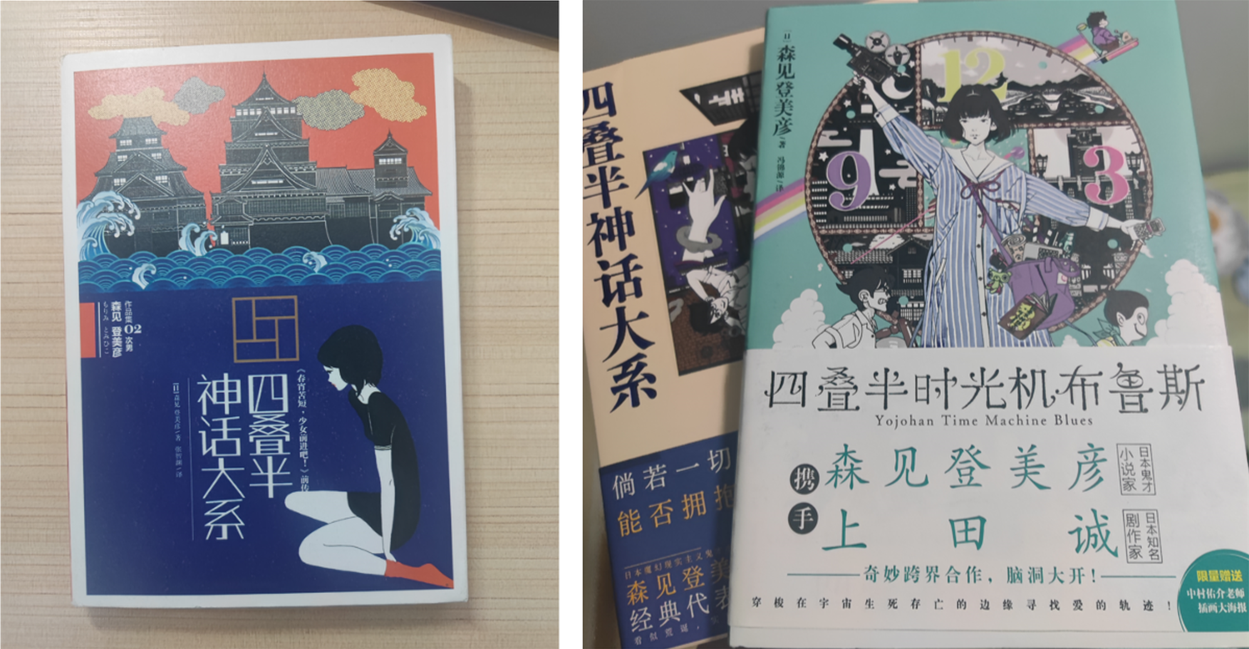书本身是很轻松愉快的,但让我回想了不少跟这个系列有关的回忆。高中的时候,因为室友的安利我第一次看了『四叠半神话大系』的动画;在大学期间又看了一遍动画;2020年底我高价买了一本绝版的中文译版然后把原著看了一遍(图左);2022年『四叠半神话大系』和新出的『四叠半时光机布鲁斯』又一起新印了一版中文版(图右),我第一时间买了并且在火车上把新作看完了。(实际上买了一版阅读一版传教,不过一直没送出去就是了。)