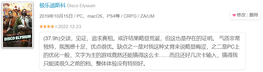 特别地,我觉得难能可贵、也能促进行业发展的一点是,『极乐迪斯科』展示了电子游戏的内容包容性和强大的性能。电子游戏一方面可以给传统媒介增加交互性和沉浸感、拓宽艺术性,另一方面又降低了人们接受严肃内容的难度。比如我,可能很难静下来看一本艰深的大部头,但也能愉快地体验『极乐迪斯科』表达的故事和思想。一定也有某个人因为这个契机,成为了真正的文学的粉丝。电子游戏在向上和向下两个维度对内容进行了拓展。