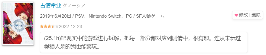 5月还玩了『GNOSIA』。这是一个真能玩狼人杀的AVG,把狼人杀游戏规则的各种身份、玩法放到了太空时空旅行的故事背景中。在一次次循环里,主角回忆起同伴和往事,认清世界的真相。『GNOSIA』很有趣,很浪漫,不太好描述,只有自己玩了才知道。