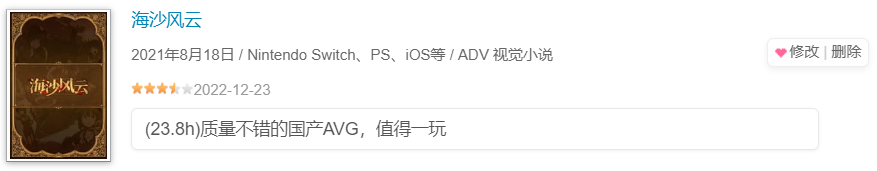 通关『空洞骑士』后我就在玩『海沙风云』了。这是一个各方面水平都在线的AVG,没什么特别需要评价,但毕竟有“国产”这一buff加持,让我有了一些好感。总之我打完了全路线、全成就。我认为比较好或新奇的有这几点:警匪题材,剧情轻松,少女主角,全程粤配。我最喜欢的是游戏整体的体验,也就是通过各种不同的视角经历同一件事情,知道完整的真相。至于缺点,主要就是不能随时读档和剧本、人设上的小问题吧。