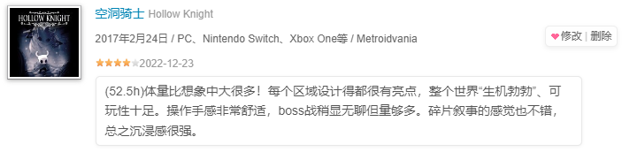 『空洞骑士』确实质量过硬。审美、设计水平在线,每个区域地图风格各异,但都又好看又好玩,NPC和剧情各有特色,共同打造了一个生机勃勃的地下虫子帝国,让我充分体验到了类银河战士恶魔城的乐趣。操作手感利索舒服,难度曲线也很合理。此外『空洞骑士』在保证质量的同时提供了相当大的体量,不管是喜欢平台跳跃还是喜欢打boss,都有不同难度的各种内容可以选择。我一边玩一边在想:这真是独立游戏吗?