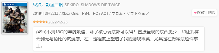 『只狼』是我心目中文化色彩很浓厚的游戏,把死亡、忍者、武士等文化展示到了极致。不管是游戏里还是游戏外,from software不像局限于普遍价值上“快意恩仇”的烂武侠,而是回归本心,走极致之路。