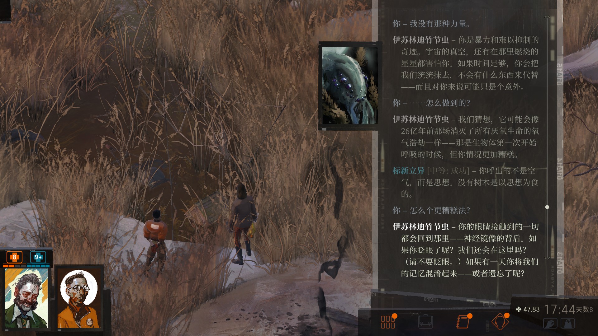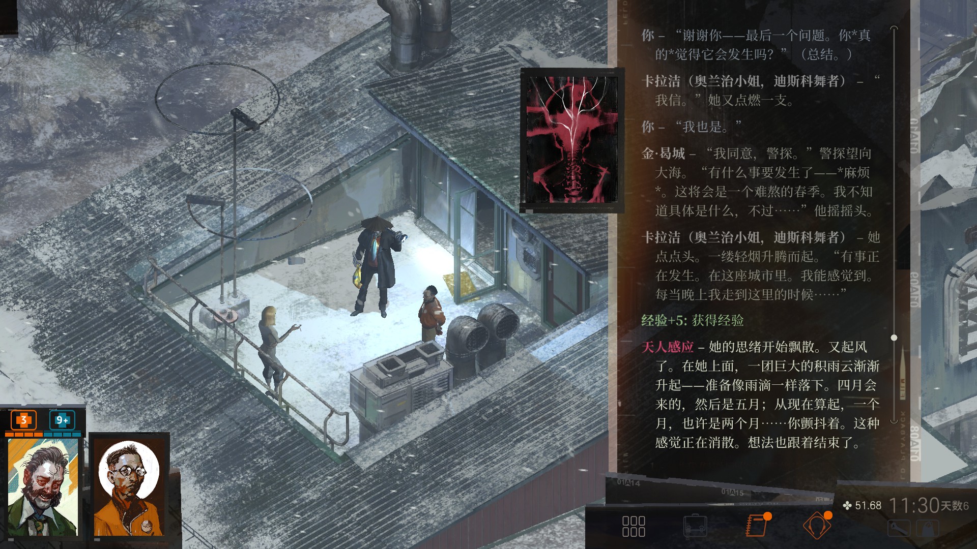 我对哲学、政治没有多大的兴趣,但在玩的过程中,我发现就算完全除去这些,『极乐迪斯科』也是一个不错的RPG。音乐、美术风格独特,搭配上故事,营造出一种混乱又颓废的气氛。此外我非常想感谢『极乐迪斯科』的汉化组。翻译比较有文学性的原著总是难的,但『极乐迪斯科』的中文翻译可以说非常出色,我光是看着24种中文技能名称都想起立鼓掌。信达雅都难以涵盖它所有的好。